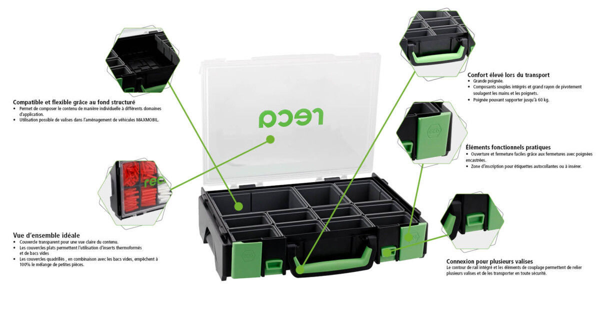 Le cœur du système VISO est constitué par les dimensions modulaires uniformes des valises. La variété des solutions de rangement vous permet d’adapter individuellement le contenu aux différents domaines d’application. Grâce aux contours de rails intégrés, vous pouvez relier plusieurs valises entre elles et les transporter.